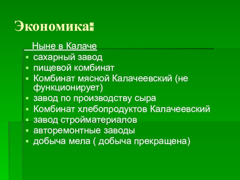 Экономика:  Ныне в Калаче сахарный заводпищевой комбинатКомбинат мясной Калачеевский (не функционирует)завод по производству сыраКомбинат хлебопродуктов Калачеевскийзавод