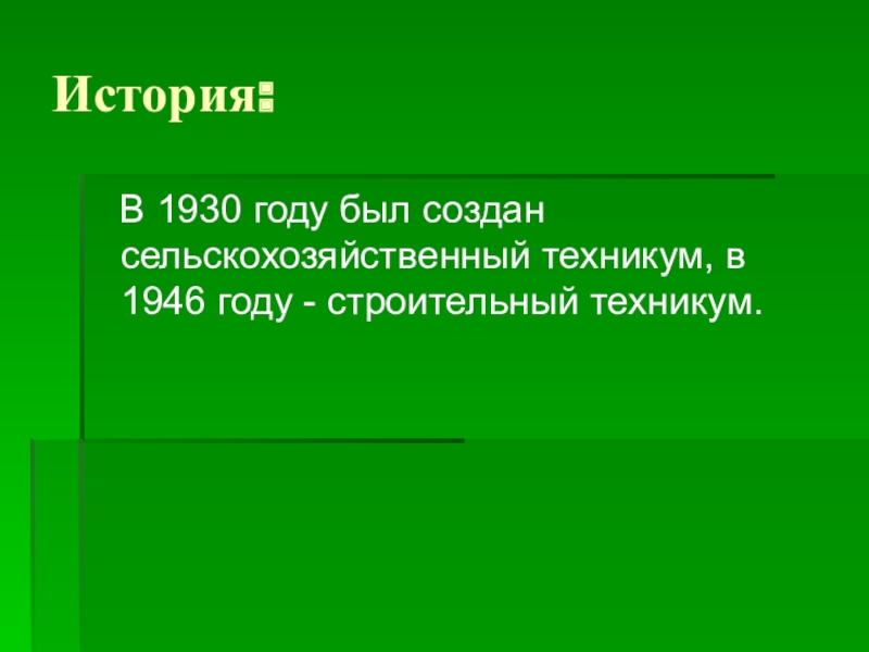 История:  В 1930 году был создан сельскохозяйственный техникум, в 1946 году - строительный техникум.