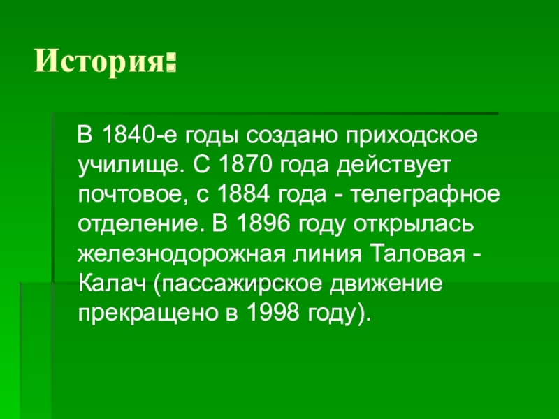 История:  В 1840-е годы создано приходское училище. С 1870 года действует почтовое, с 1884 года -