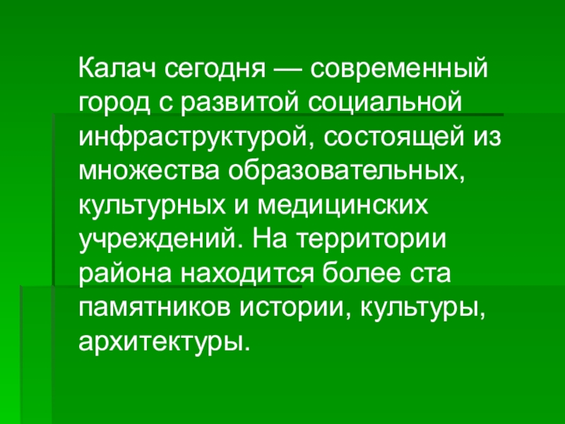 Калач сегодня — современный город с развитой социальной инфраструктурой, состоящей