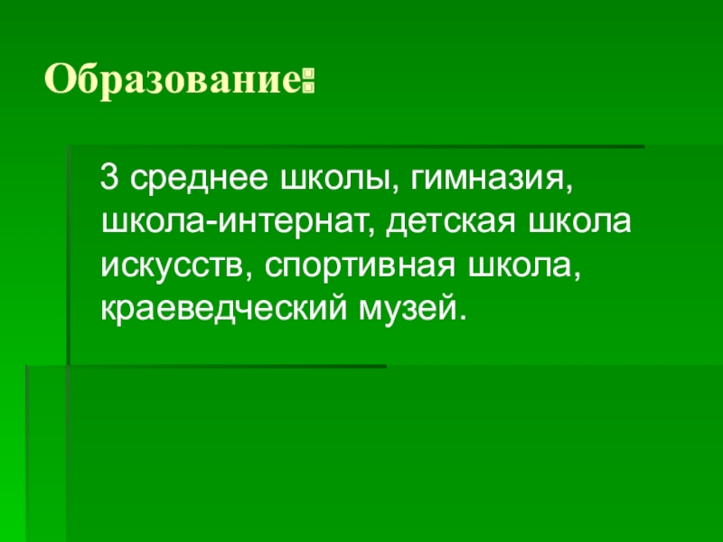 Образование:  3 среднее школы, гимназия, школа-интернат, детская школа искусств, спортивная школа, краеведческий музей.