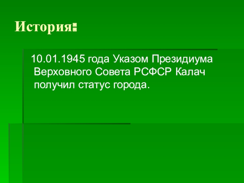 История: 10.01.1945 года Указом Президиума Верховного Совета РСФСР Калач получил статус города.