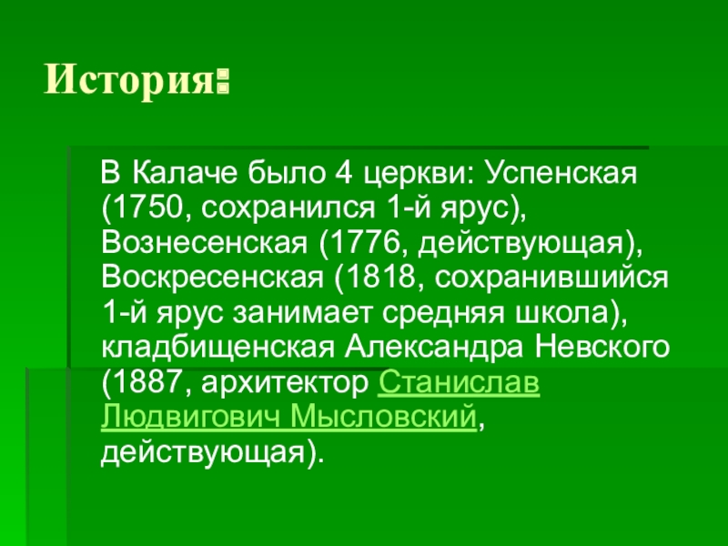 История:  В Калаче было 4 церкви: Успенская (1750, сохранился 1-й ярус), Вознесенская (1776, действующая), Воскресенская (1818,