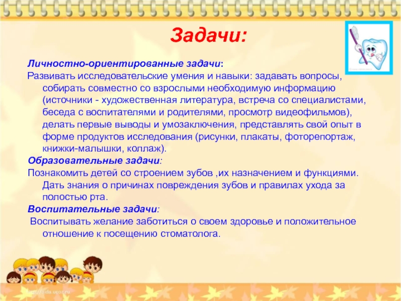 Познакомить детей со строением зубов ,их назначением и функциями. Дать знания о причинах повреждения зубов и правилах ухода за полостью рта.