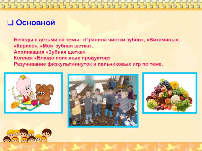 Беседы с детьми на темы: «Правила чистки зубов», «Витамины», «Кариес»,