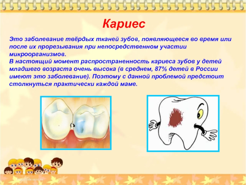 остается одним из самых распространенных заболеваний детей дошкольного возраста в России. Дети в возрасте 1 года имели кариес зубов в 12,2% случаев, в возрасте 3 лет – 57,7%, 6 лет - 85,4%.
