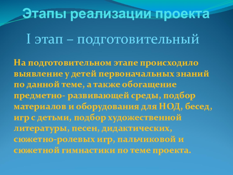 детей первоначальных знаний по данной теме, а также обогащение предметно- развивающей среды, подбор материалов и оборудования для НОД, бесед, игр с детьми, подбор художественной литературы, песен, дидактических, сюжетно-ролевых игр, пальчиковой и сюжетной гимнастики по теме проекта.