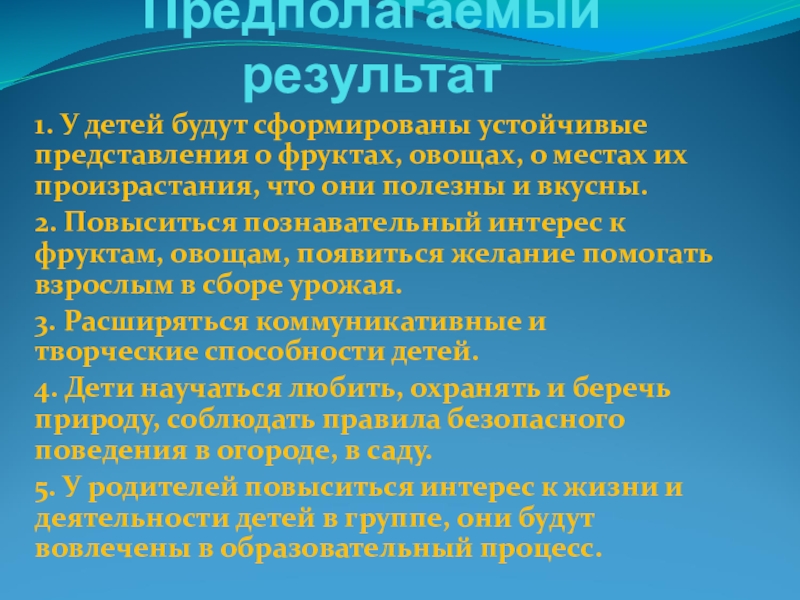 1. У детей будут сформированы устойчивые представления о фруктах, овощах,