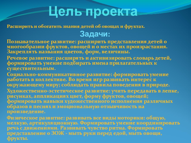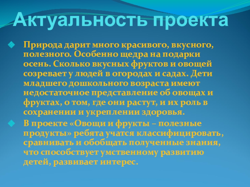 В проекте «Овощи и фрукты – полезные продукты» ребята учатся классифицировать, сравнивать и обобщать полученные знания, что способствует умственному развитию детей, развивает интерес.