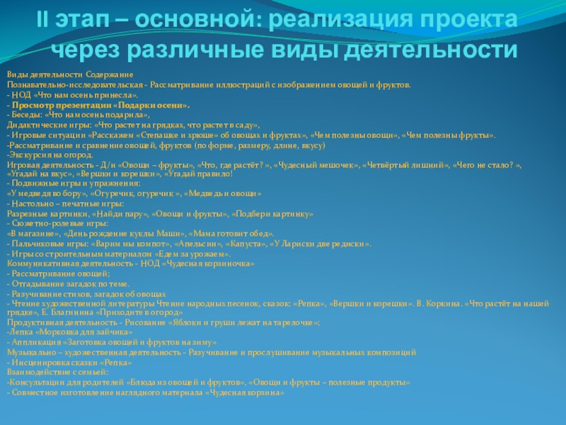 Слайд 7II этап – основной: реализация проекта через различные виды деятельности