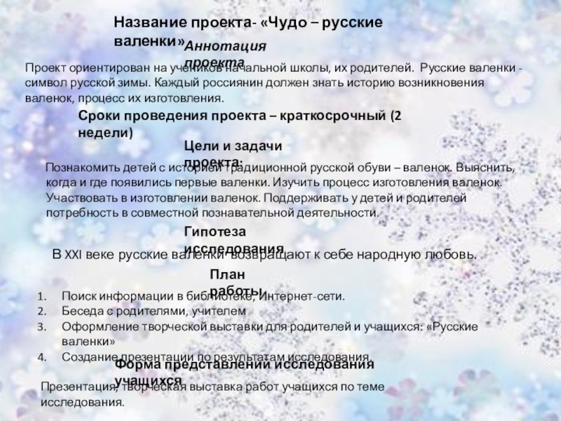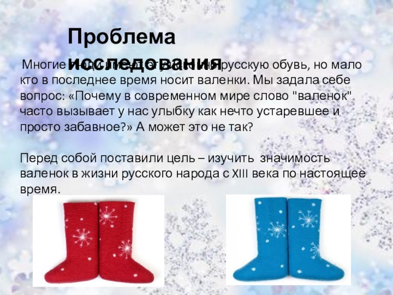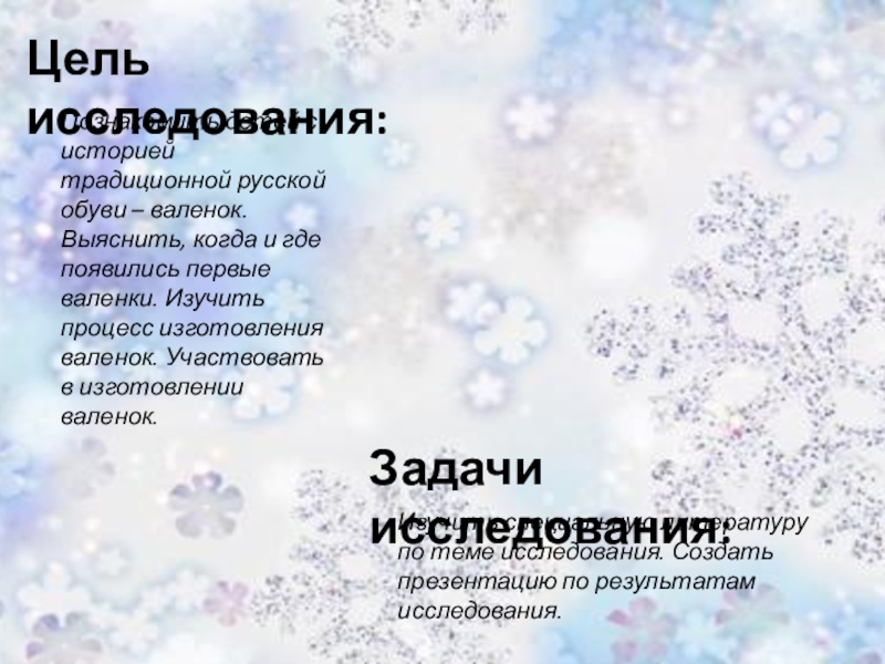 Познакомить детей с историей традиционной русской обуви – валенок. Выяснить, когда и где появились первые валенки. Изучить процесс изготовления валенок. Участвовать в изготовлении валенок. Поддерживать у детей и родителей потребность в совместной познавательной деятельности.