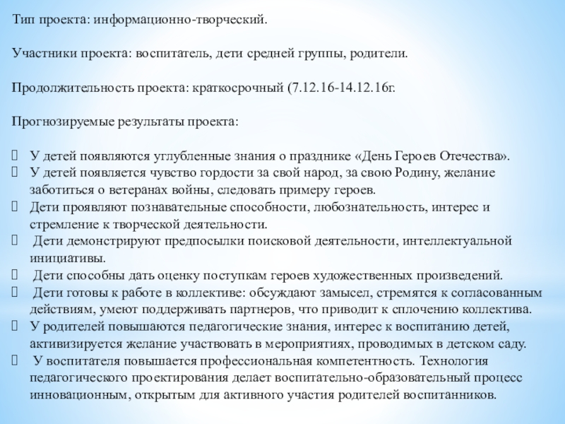 У воспитателя повышается профессиональная компетентность. Технология педагогического проектирования делает воспитательно-образовательный процесс инновационным, открытым для активного участия родителей воспитанников.