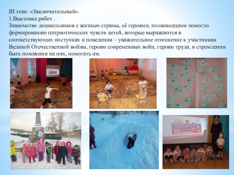 полководцами помогло формированию патриотических чувств детей, которые выражаются в соответствующих поступках и поведении – уважительное отношение к участникам Великой Отечественной войны, героям современных войн, героям труда, в стремлении быть похожими на них, помогать им.