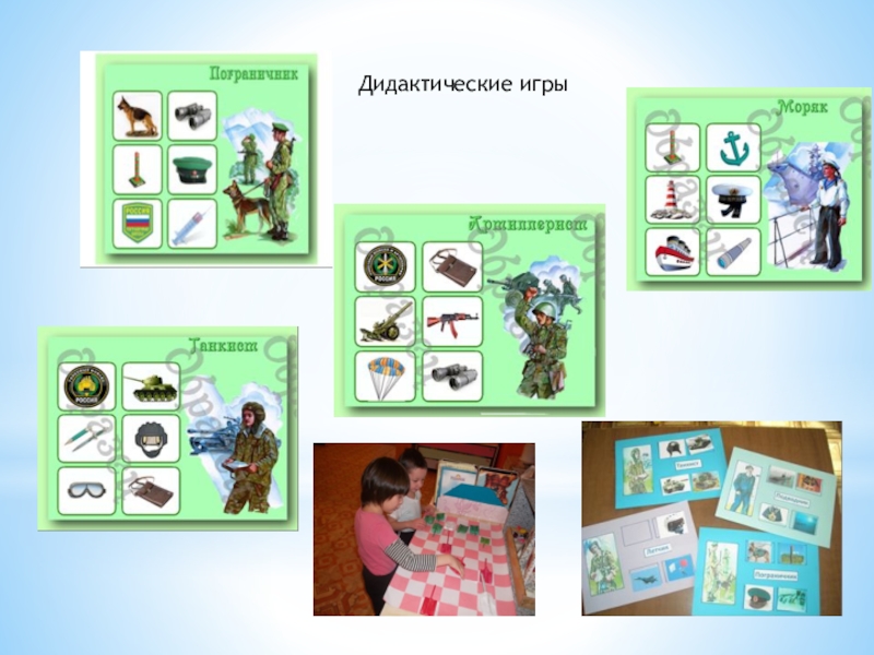 - дидактические: «Что нужно солдату, моряку, пограничнику,», «Боевые медали», «Военная техника», «Танковые сражения».
