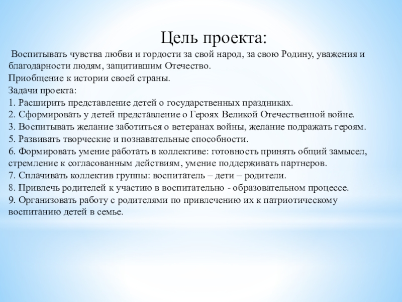 Воспитывать чувства любви и гордости за свой народ, за свою Родину, уважения и благодарности людям, защитившим Отечество.