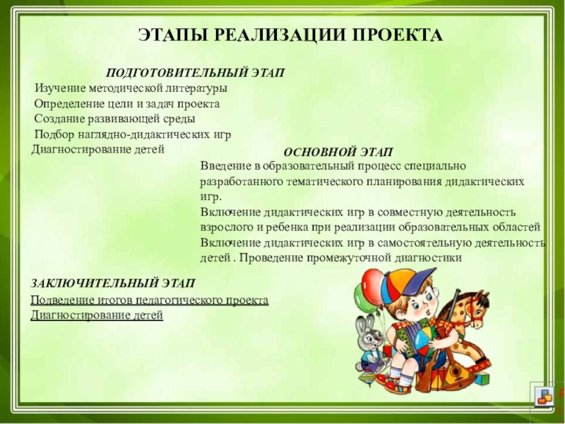 Включение дидактических игр в совместную деятельность взрослого и ребенка при реализации образовательных областей Включение дидактических игр в самостоятельную деятельность детей . Проведение промежуточной диагностики