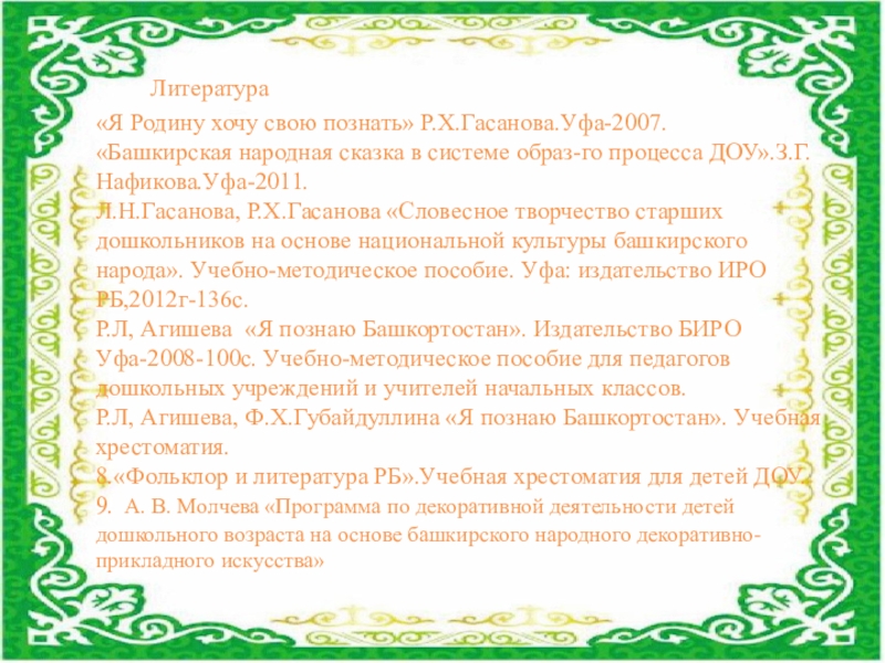 Л.Н.Гасанова, Р.Х.Гасанова «Словесное творчество старших дошкольников на основе национальной культуры башкирского народа». Учебно-методическое пособие. Уфа: издательство ИРО РБ,2012г-136с.