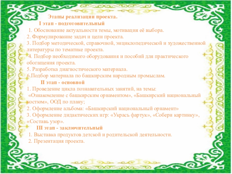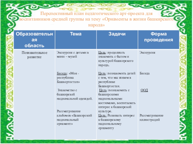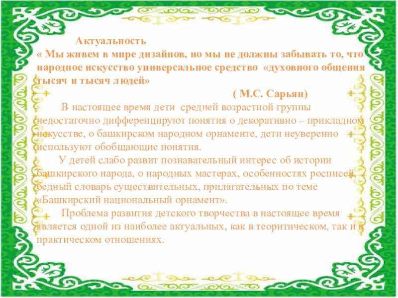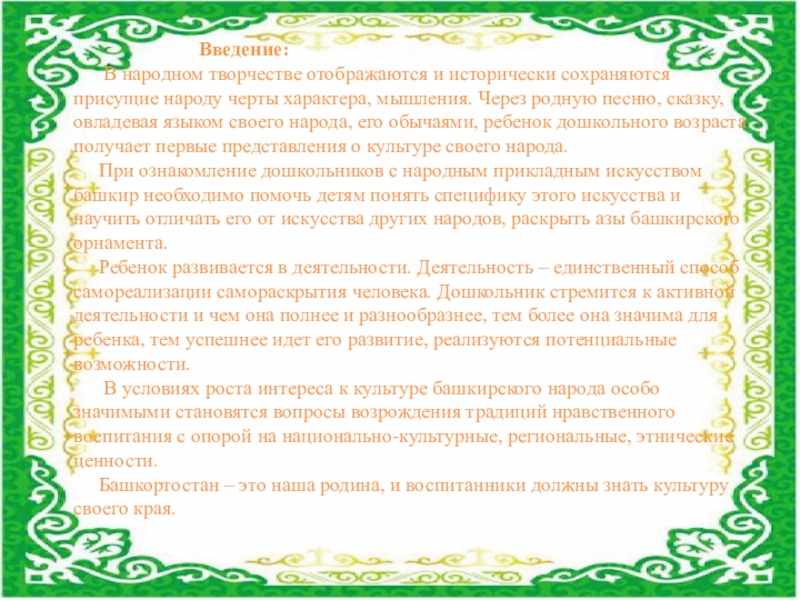 При ознакомление дошкольников с народным прикладным искусством башкир необходимо помочь детям понять специфику этого искусства и научить отличать его от искусства других народов, раскрыть азы башкирского орнамента.