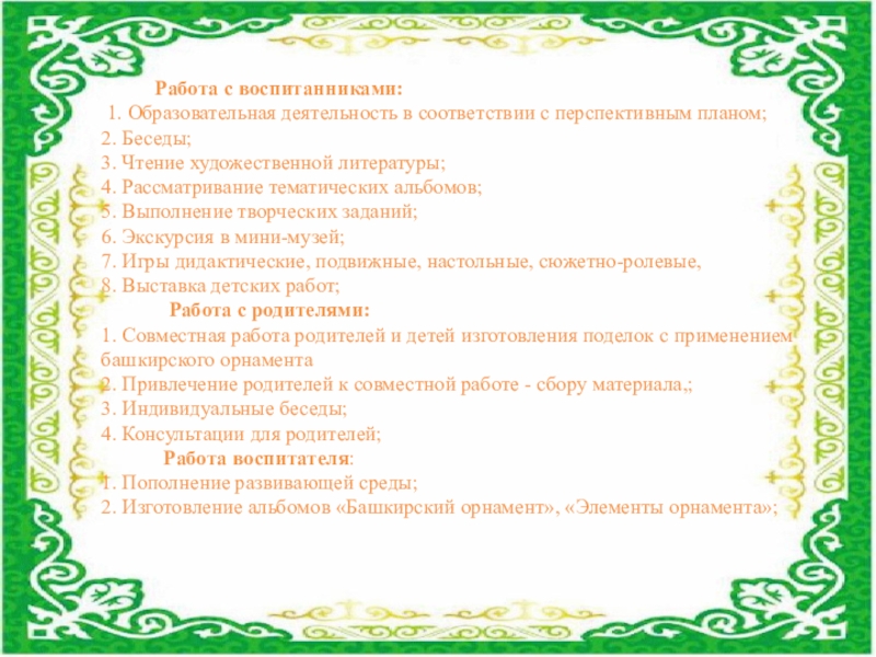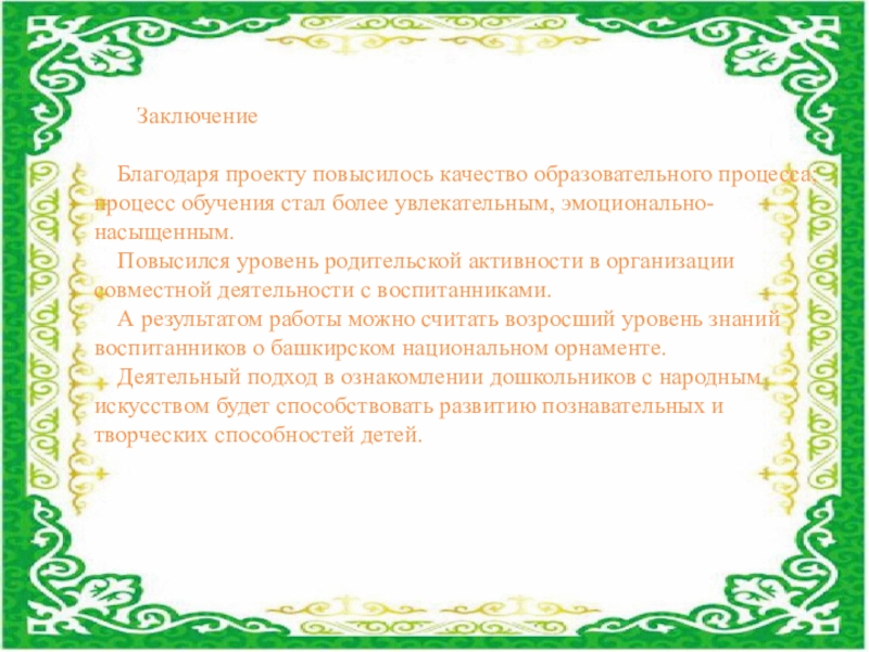 А результатом работы можно считать возросший уровень знаний воспитанников о башкирском национальном орнаменте.