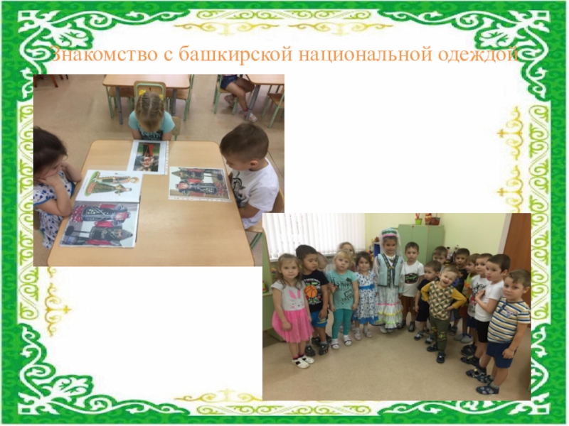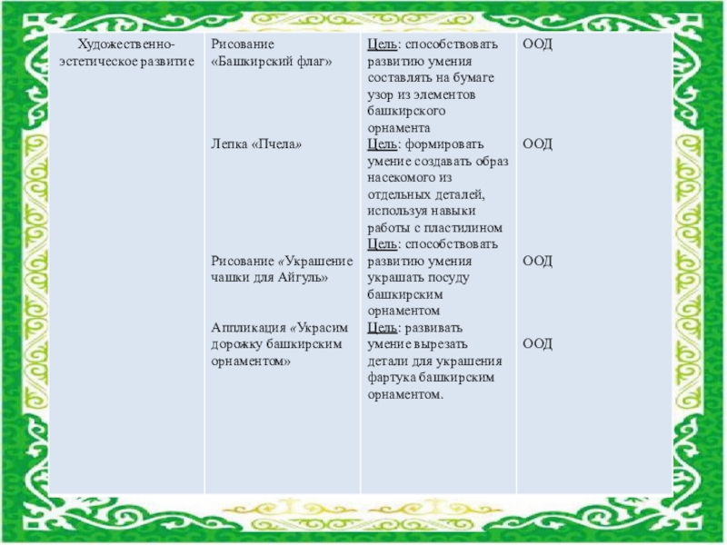 «Ознакомление с башкирским орнаментом», «Башкирский национальный костюм», ООД по плану;
