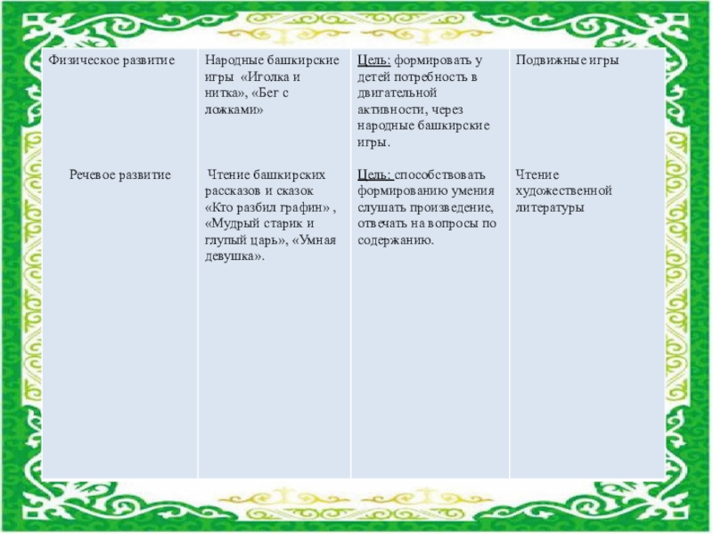 - Продолжать знакомить детей с народным искусством, познакомить детей с костюмами, традициями, бытом башкирского народа.