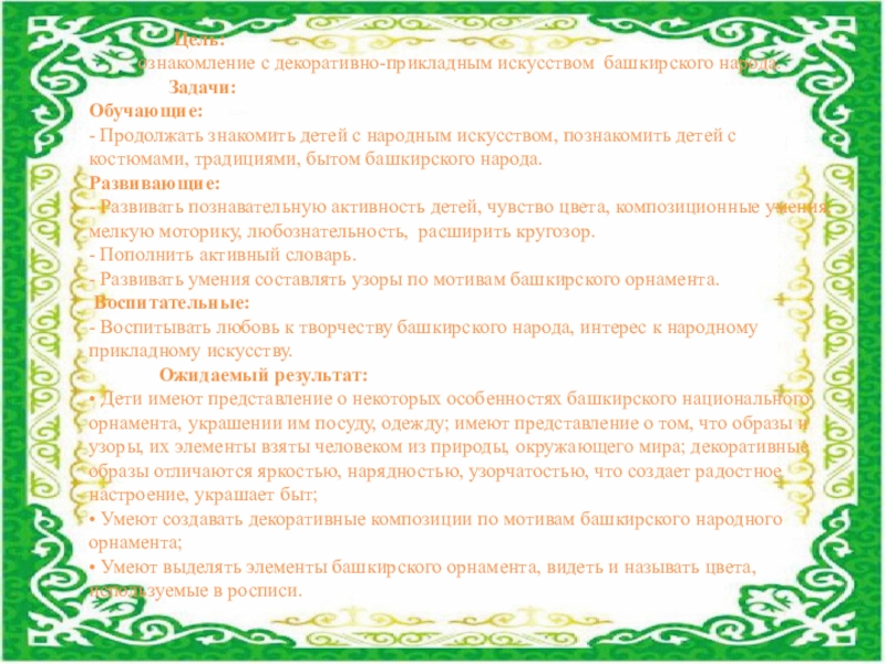 - Воспитывать любовь к творчеству башкирского народа, интерес к народному прикладному искусству.