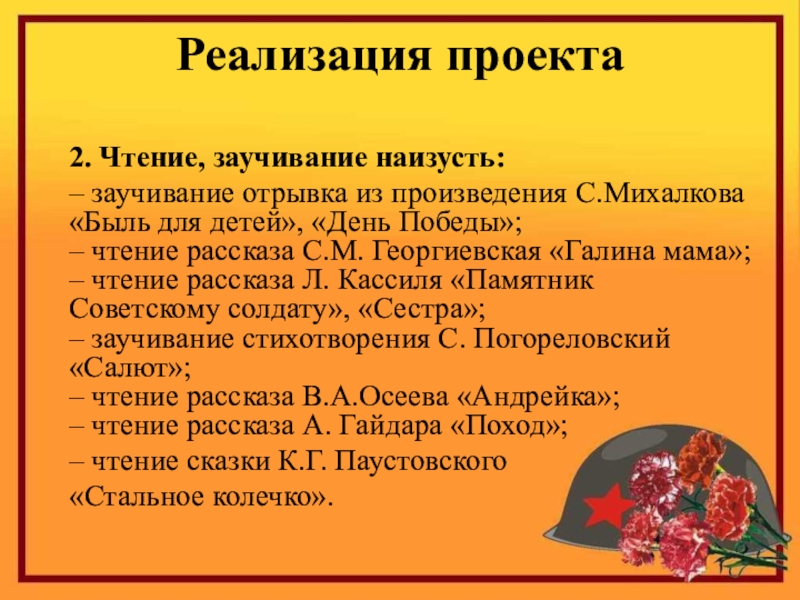 – чтение рассказа Л. Кассиля «Памятник Советскому солдату», «Сестра»;