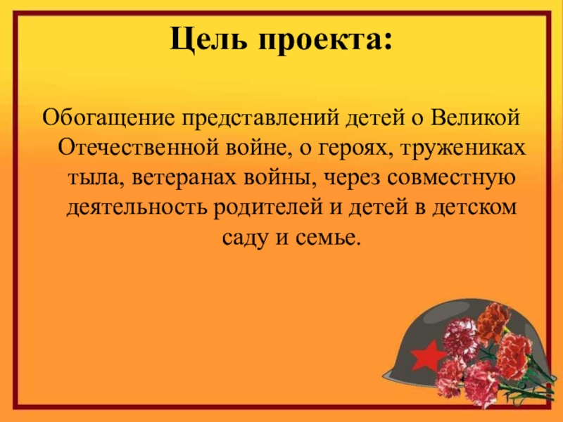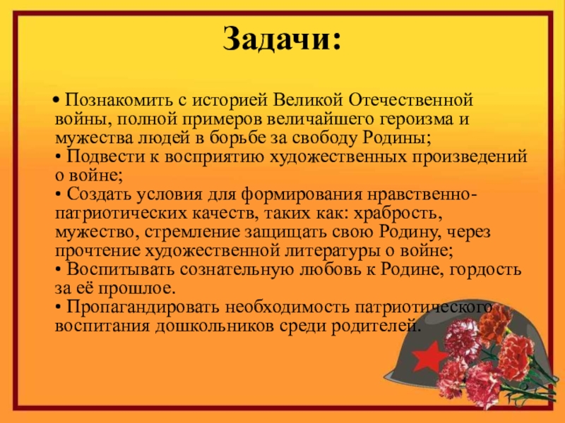 • Познакомить с историей Великой Отечественной войны, полной примеров