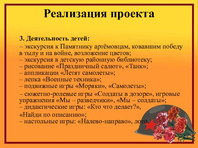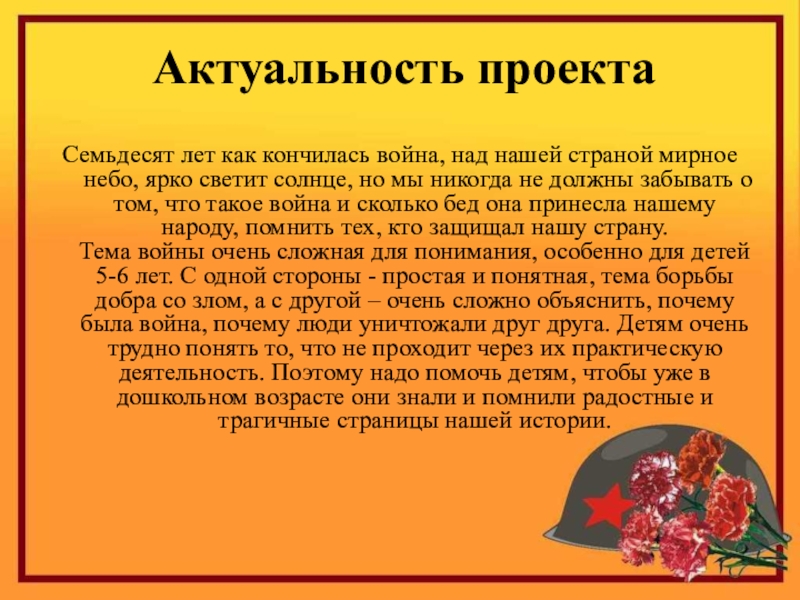 Тема войны очень сложная для понимания, особенно для детей 5-6 лет. С одной стороны - простая и понятная, тема борьбы добра со злом, а с другой – очень сложно объяснить, почему была война, почему люди уничтожали друг друга. Детям очень трудно понять то, что не проходит через их практическую деятельность. Поэтому надо помочь детям, чтобы уже в дошкольном возрасте они знали и помнили радостные и трагичные страницы нашей истории.