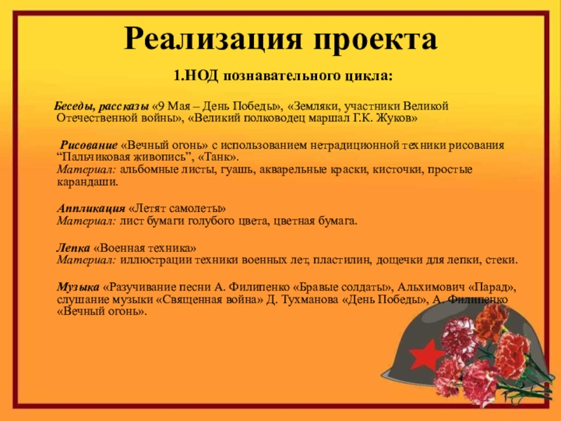 Музыка «Разучивание песни А. Филипенко «Бравые солдаты», Альхимович «Парад», слушание музыки «Священная война» Д. Тухманова «День Победы», А. Филипенко «Вечный огонь».