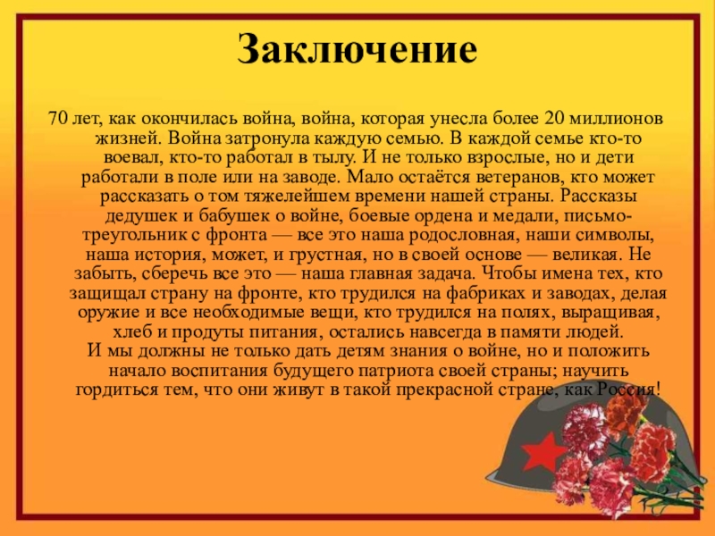 жизней. Война затронула каждую семью. В каждой семье кто-то воевал, кто-то работал в тылу. И не только взрослые, но и дети работали в поле или на заводе. Мало остаётся ветеранов, кто может рассказать о том тяжелейшем времени нашей страны. Рассказы дедушек и бабушек о войне, боевые ордена и медали, письмо-треугольник с фронта — все это наша родословная, наши символы, наша история, может, и грустная, но в своей основе — великая. Не забыть, сберечь все это — наша главная задача. Чтобы имена тех, кто защищал страну на фронте, кто трудился на фабриках и заводах, делая оружие и все необходимые вещи, кто трудился на полях, выращивая, хлеб и продуты питания, остались навсегда в памяти людей.
