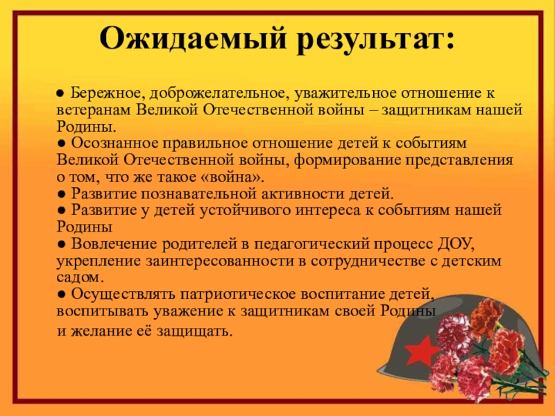 ● Осознанное правильное отношение детей к событиям Великой Отечественной войны, формирование представления о том, что же такое «война».