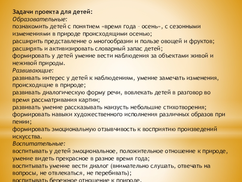 Задачи проекта для детей:Образовательные:познакомить детей с понятием «время года – осень», с сезонными изменениями в природе происходящими
