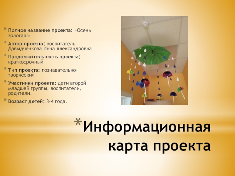 Информационная карта проекта Полное название проекта: «Осень золотая!»Автор проекта: воспитатель Давыдченкова Инна АлександровнаПродолжительность проекта: краткосрочный Тип проекта: