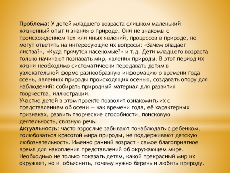 о природе. Они не знакомы с происхождением тех или иных явлений, процессов в природе, не могут ответить на интересующие их вопросы: «Зачем опадает листва?», «Куда прячутся насекомые?» и т.д. Дети младшего возраста только начинают познавать мир, явления природы. В этот период их жизни необходимо систематически передавать детям в увлекательной форме разнообразную информацию о времени года — осень, явлениях природы происходящих осенью, создавать опору для наблюдений: собирать природный материал для развития творчества, иллюстрации. Участие детей в этом проекте позволит ознакомить их с представлением об осени — как времени года, её характерных признаках, развить творческие способности, поисковую деятельность, связную речь.