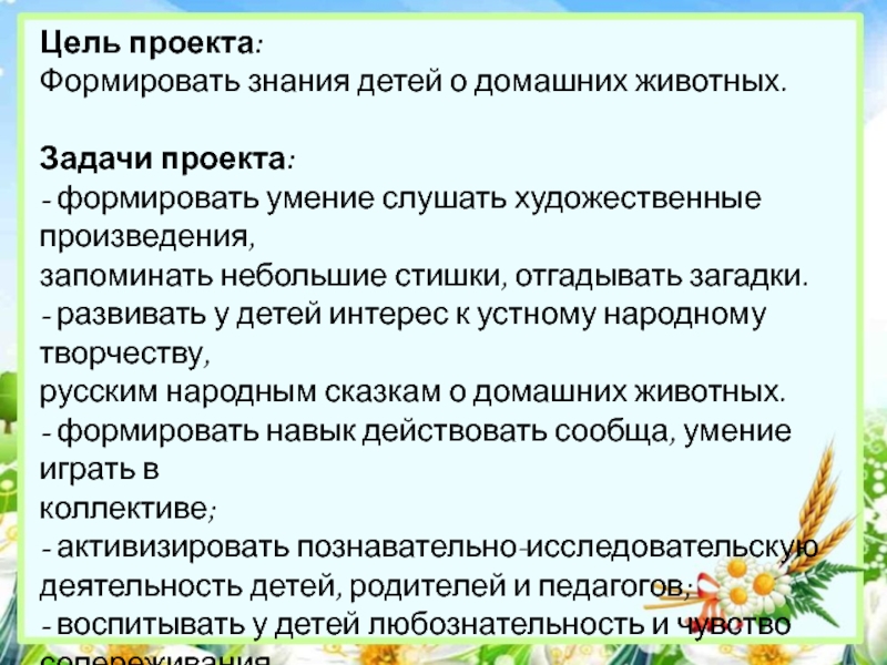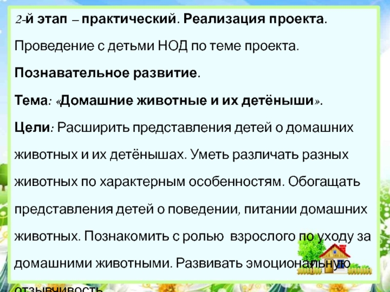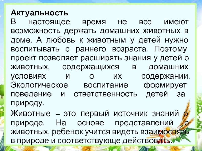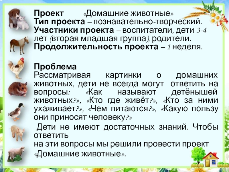 доме. А любовь к животным у детей нужно воспитывать с раннего возраста. Поэтому проект позволяет расширять знания у детей о