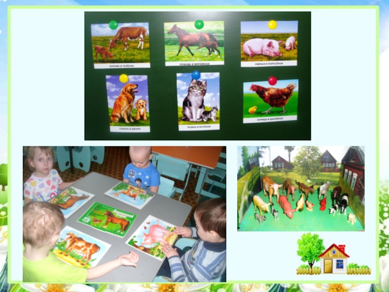 Цели: Расширить представления детей о домашних животных и их детёнышах. Уметь различать разных животных по характерным особенностям. Обогащать представления детей о поведении, питании домашних животных. Познакомить с ролью взрослого по уходу за домашними животными. Развивать эмоциональную отзывчивость.