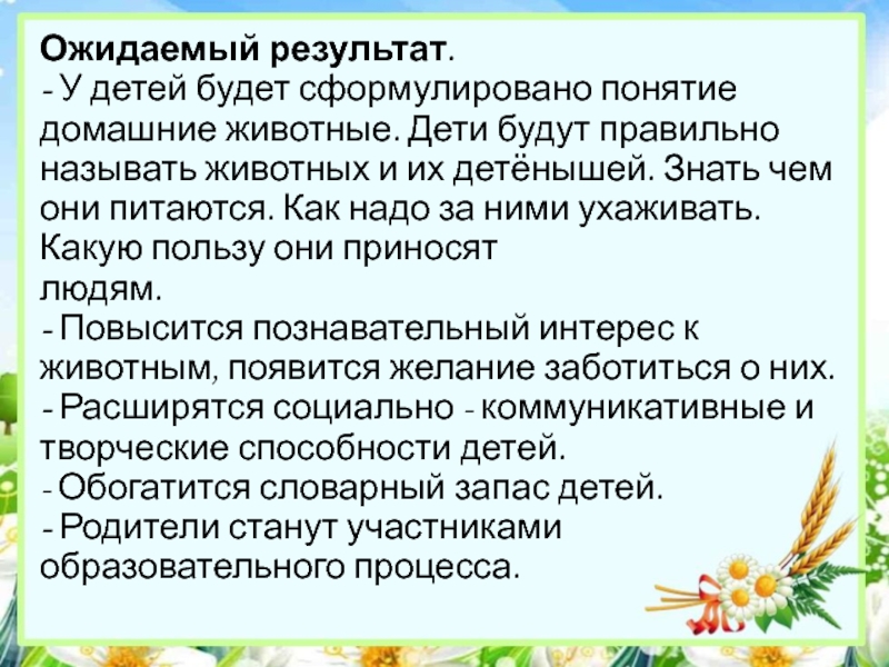 - У детей будет сформулировано понятие домашние животные. Дети будут