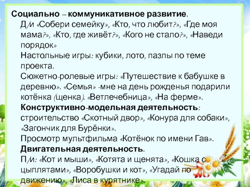Сюжетно-ролевые игры: «Путешествие к бабушке в деревню». «Семья» -мне на день рожденья подарили котёнка (щенка). «Ветлечебница», «На ферме».