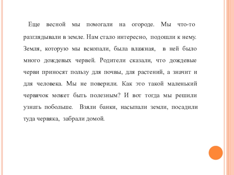 земле. Нам стало интересно, подошли к нему. Земля, которую мы вскопали, была влажная, в ней было много дождевых червей. Родители сказали, что дождевые черви приносят пользу для почвы, для растений, а значит и для человека. Мы не поверили. Как это такой маленький червячок может быть полезным? И вот тогда мы решили узнать побольше. Взяли банки, насыпали земли, посадили туда червяка, забрали домой.