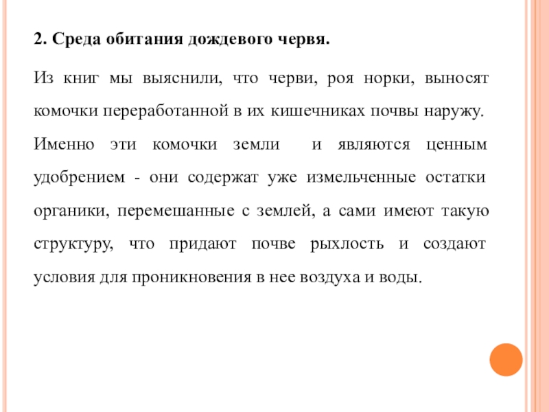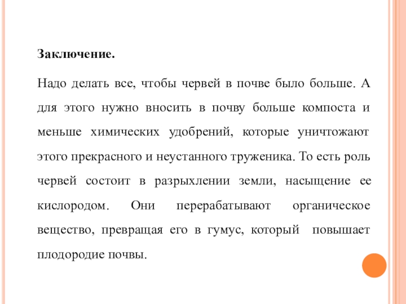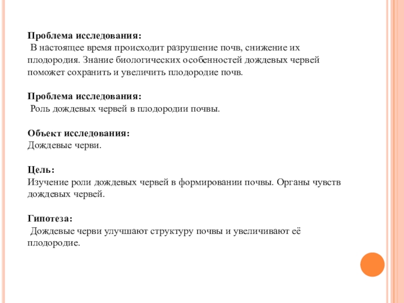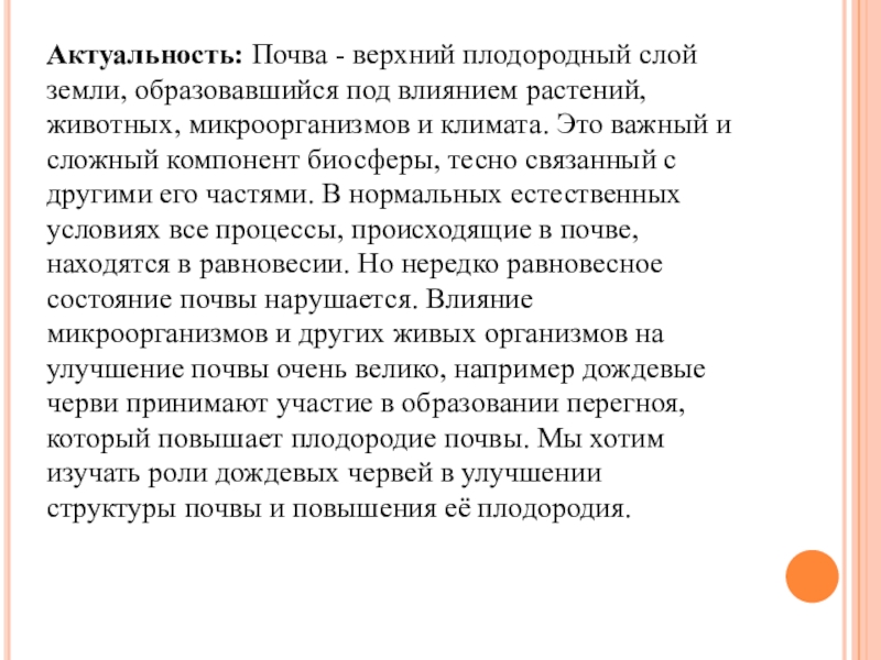 животных, микроорганизмов и климата. Это важный и сложный компонент биосферы, тесно связанный с другими его частями. В нормальных естественных условиях все процессы, происходящие в почве, находятся в равновесии. Но нередко равновесное состояние почвы нарушается. Влияние микроорганизмов и других живых организмов на улучшение почвы очень велико, например дождевые черви принимают участие в образовании перегноя, который повышает плодородие почвы. Мы хотим изучать роли дождевых червей в улучшении структуры почвы и повышения её плодородия.