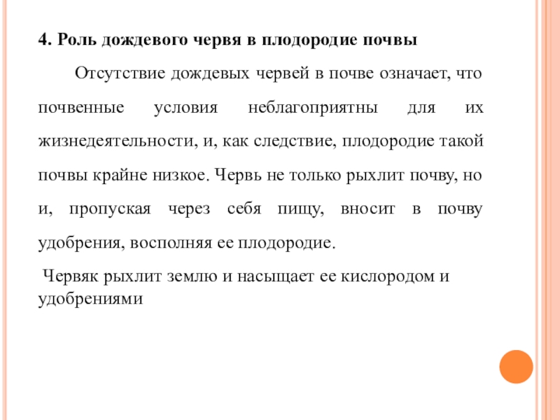 дождевых червей в почве означает, что почвенные условия неблагоприятны для их жизнедеятельности, и, как следствие, плодородие такой почвы крайне низкое. Червь не только рыхлит почву, но и, пропуская через себя пищу, вносит в почву удобрения, восполняя ее плодородие.