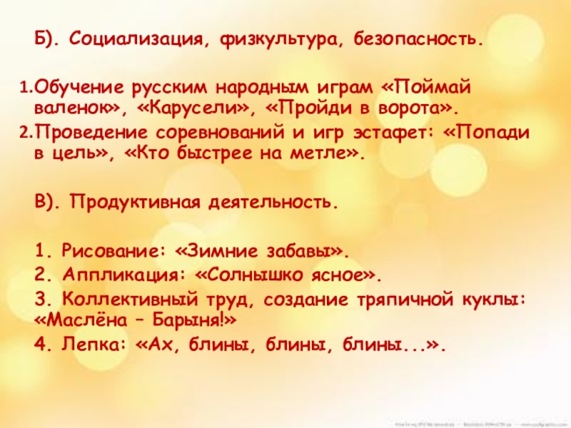 Слайд 10Б). Социализация, физкультура, безопасность.