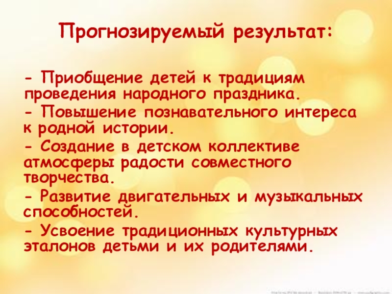называть традиционные обряды народного гуляния, формирование устойчивого интереса к национальной культуре.