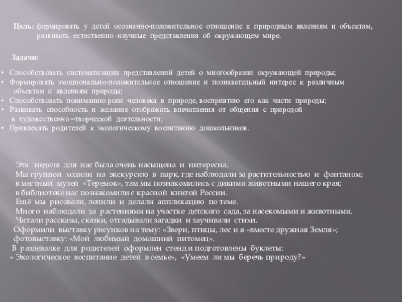 Способствовать пониманию роли человека в природе, восприятию его как части природы;