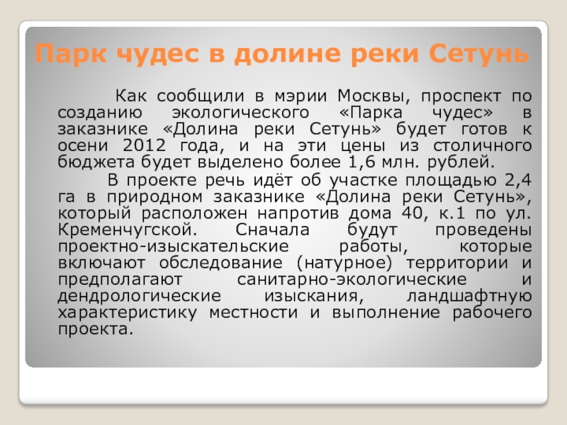 Основная тема проекта – этническая деревня. «Предполагается, что в парке будут установлены деревянные структуры героев детских сказок, возить гостей столицы и москвичей на электромобилях. Кроме этого, будет разбит парково-садовый аттракцион «Деревня мастеров», установлены беседки и вольеры с домашними животными, построены детские площадки, цветники, кормушки для птиц, а также обустроена дорожно-тропиночная сеть.