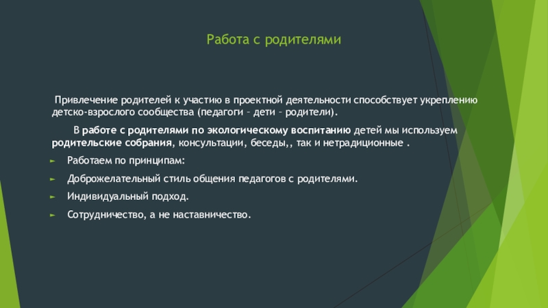 В работе с родителями по экологическому воспитанию детей мы используем родительские собрания, консультации, беседы,, так и нетрадиционные .
