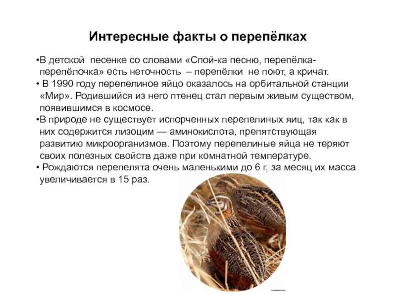 В 1990 году перепелиное яйцо оказалось на орбитальной станции «Мир». Родившийся из него птенец стал первым живым существом, появившимся в космосе.