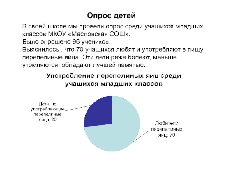 Выяснилось , что 70 учащихся любят и употребляют в пищу перепелиные яйца. Эти дети реже болеют, меньше утомляются, обладают лучшей памятью.