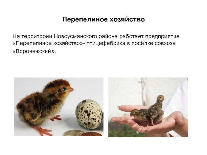 На территории Новоусманского района работает предприятие «Перепелиное хозяйство»- птицефабрика в